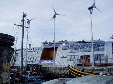 Energy needs are met by a wood pellet boiler, wind turbines and solar thermal panels.